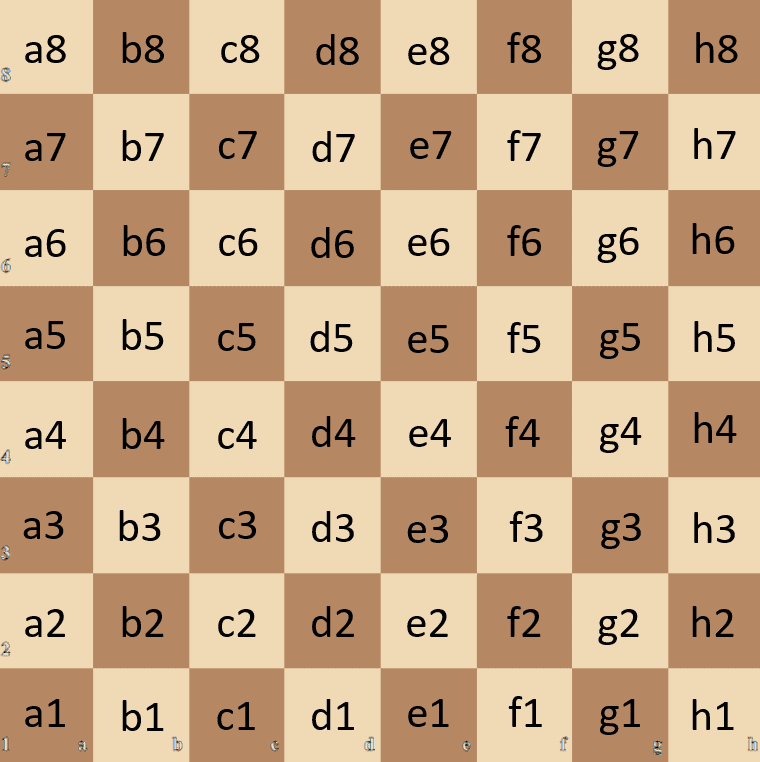 Each of the 64 squares on a chess board has an identity using its file(letter) and rank(number)
