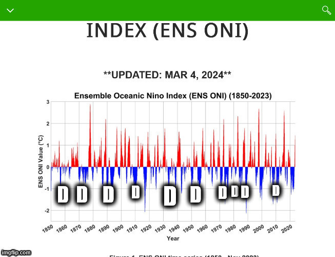 Here is Larry's graph again. I inserted D's below the La Nina's that correlated with the widespread droughts in the United States at that time.