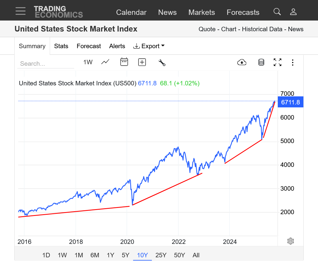 2. 1 year: Potential double top. Challenging the recent, accelerated uptrend. Still well above the previous highs in early 2025 and WAY above the spike lows from Trump's ruinous tariff schemes agenda announcement in early April.