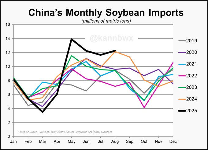 China imported 12.28 million metric tons (451 mln bu) of soybeans in August. That edged last year's record by 1% and easily beat expectations closer to 11 mmt. Crushers reportedly overbought beans amid a lack of progress with the U.S.-China trade talks.