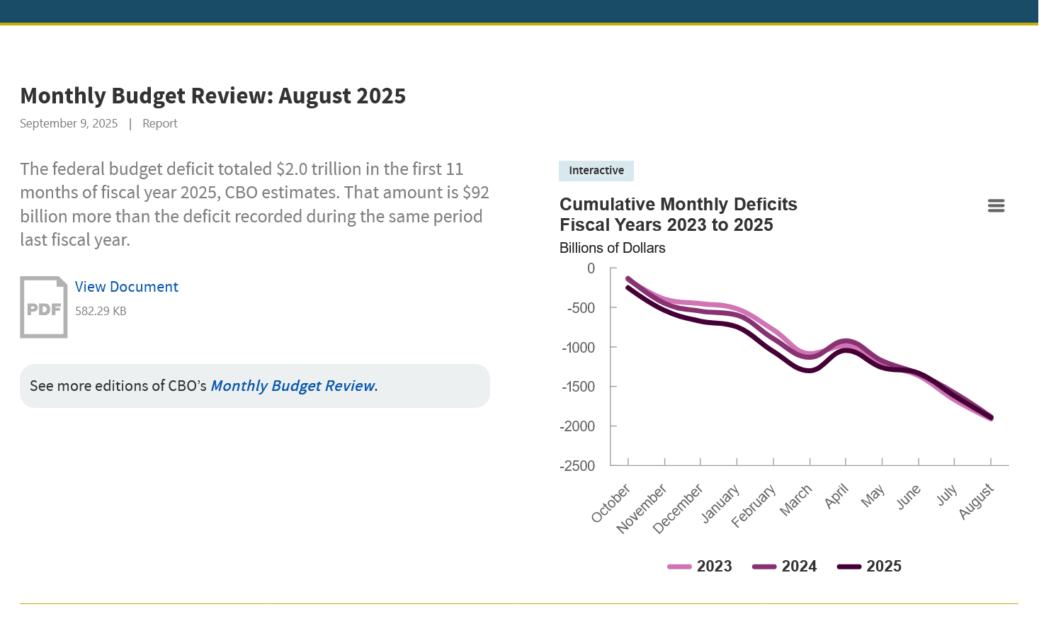 The federal budget deficit totaled $2.0 trillion in the first 11 months of fiscal year 2025, CBO estimates. That amount is $92 billion more than the deficit recorded during the same period last fiscal year