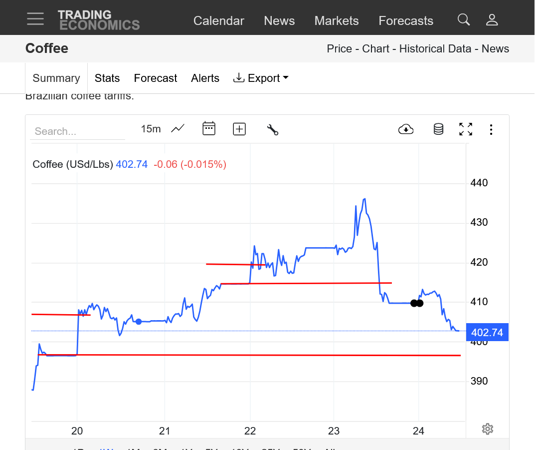I should mention that Trump's political 50% tariff on Brazil coffee to punish Brazil for not treating his far right friend right (making the price of coffee for US consumers MUCH more expensive if its not lifted) is a looming risk to traders that might have the wrong position if news comes out from Trump, which is typical of his tariffs...... that he suddenly is changing the terms of this particular tariff.