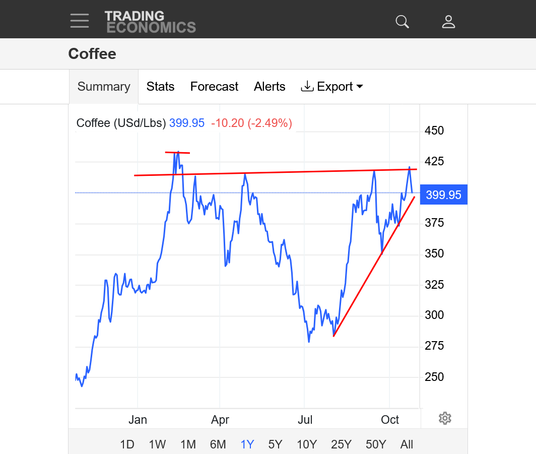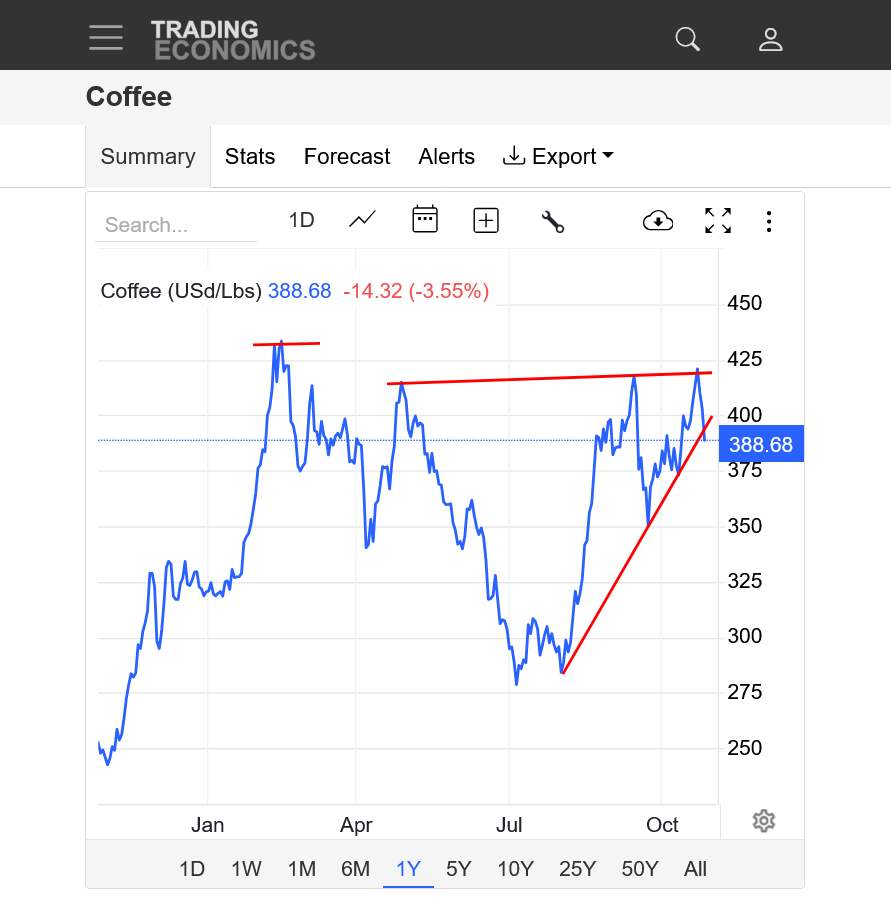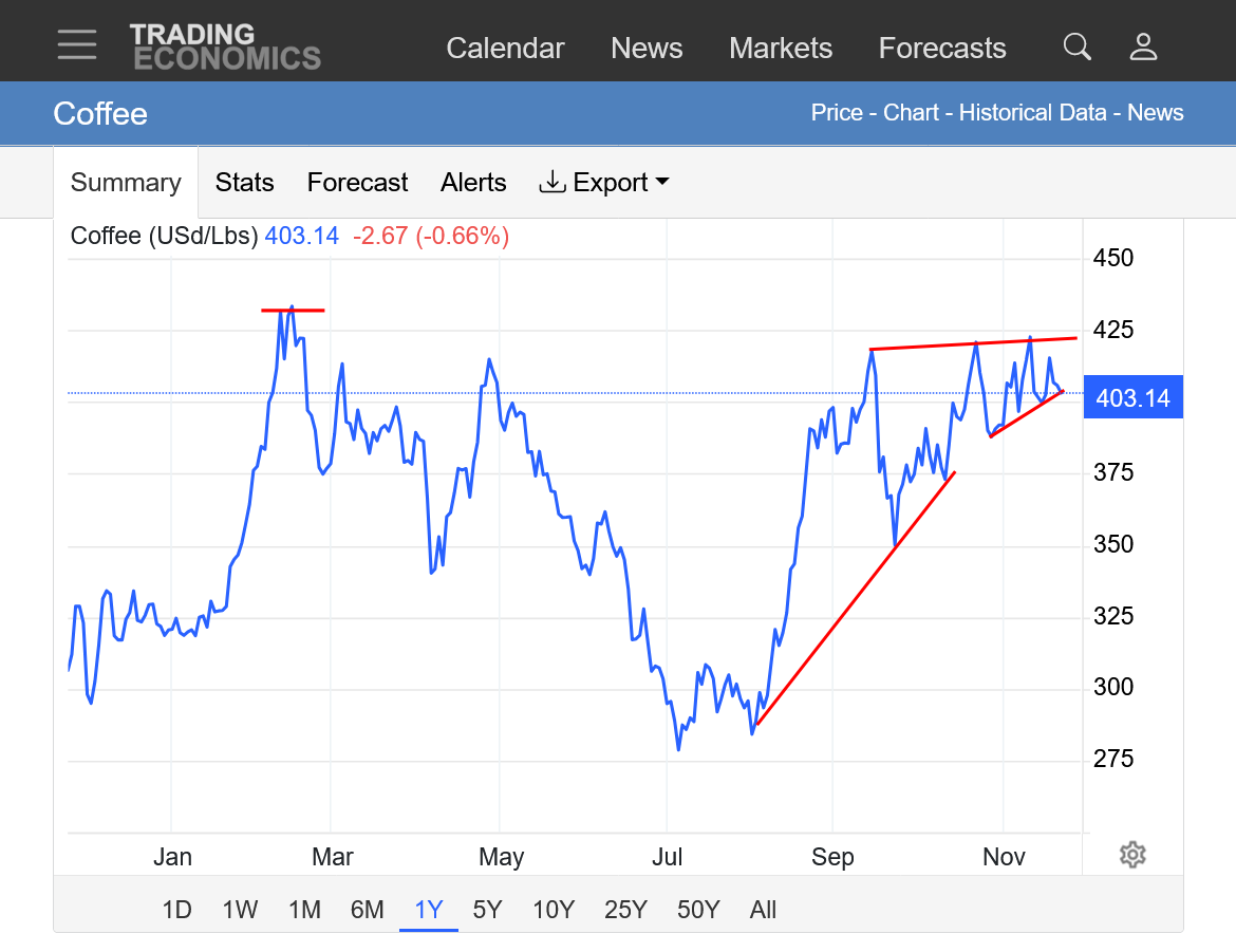 2. 1 year: Top in Feb 2025. Lower high April 2025. Low in July put in after Trump announced a 50% tariff on Brazil coffee. Is this a flag pattern?? Breaking out to the upside above the downtrend? Still well below the highs from earlier this year.