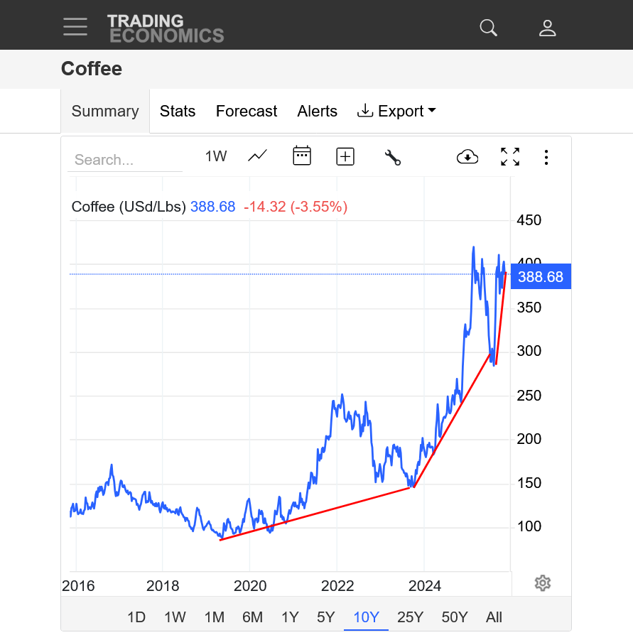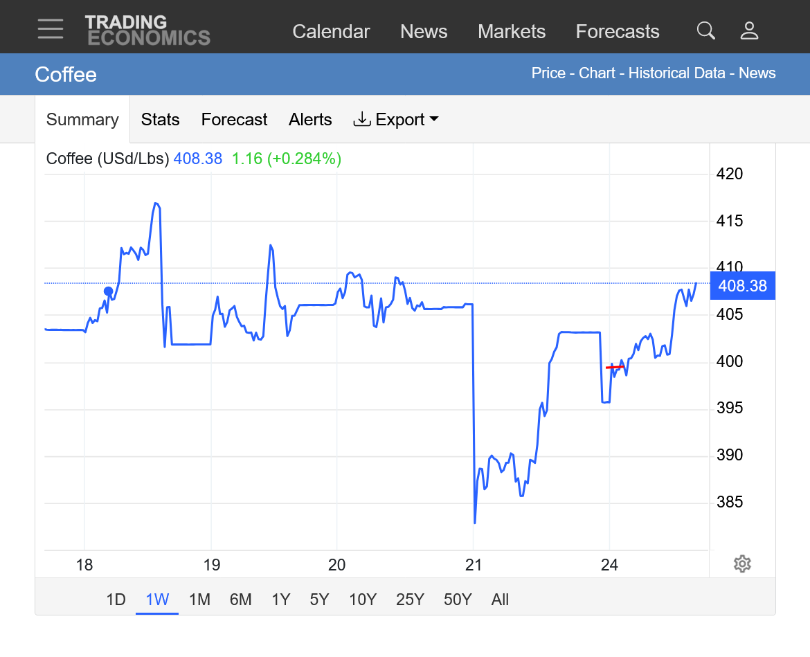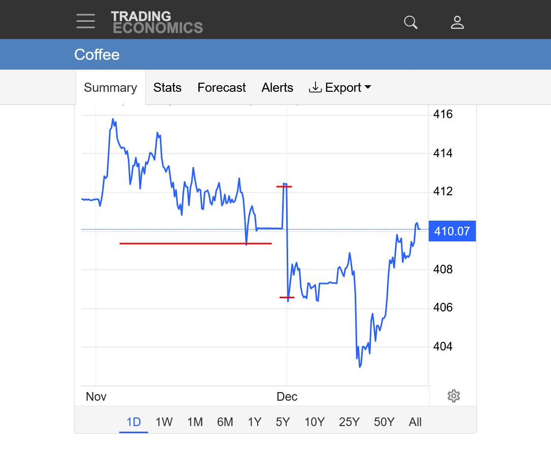 At the link above, I just read their explanation for the price being higher today. It’s the severe drought in Brazil being caused by climate change.