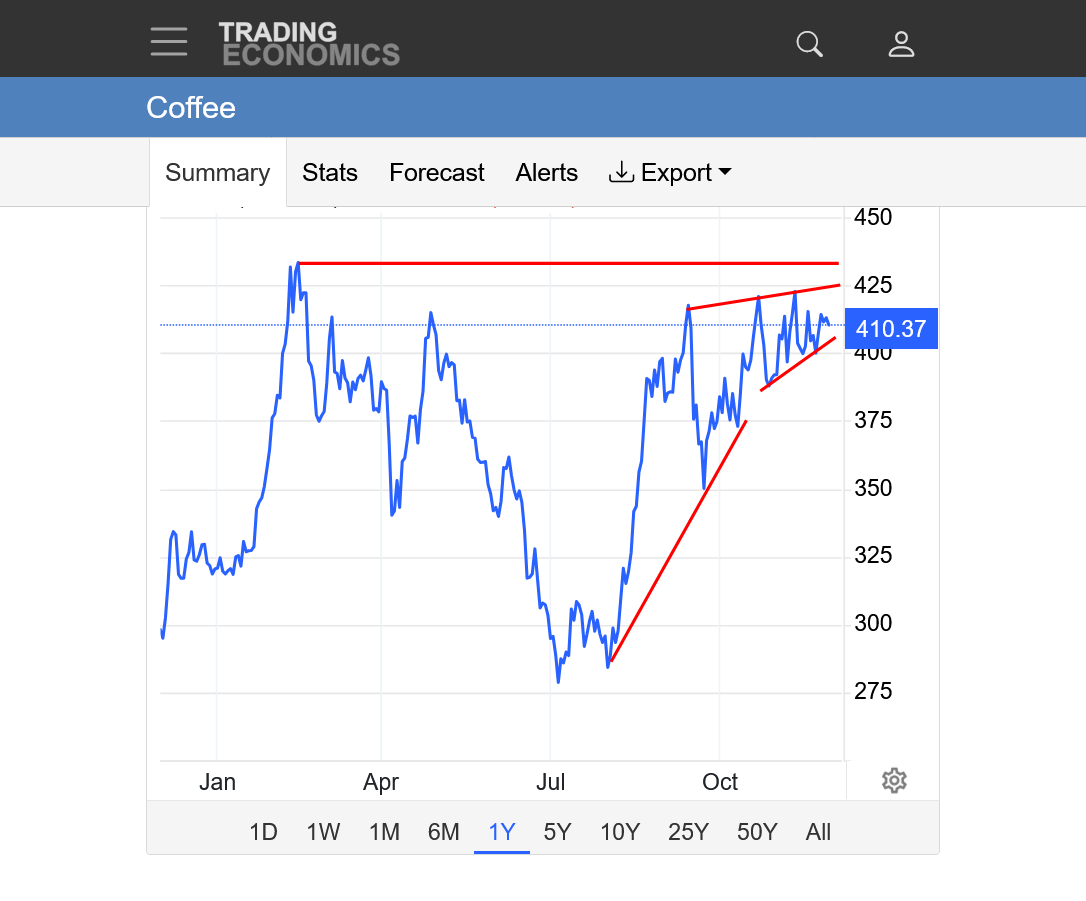 2. 1 year: Coil or tightening wedge formation. Ascending triangle, with distinctly higher lows and close to the same highs. Technically looks pretty bullish and predicts an upside breakout BUT THE WEATHER in key production areas of #1 coffee producer Brazil is bearish.