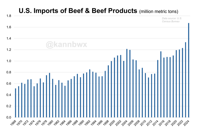 U.S. beef & beef product imports were record high in 2024 (up 25% on the year). Jan-July 2025 imports were up 27% over the same period in 2024. But U.S. beef prices have still surged in the last year+ *despite* the huge spike in imports.