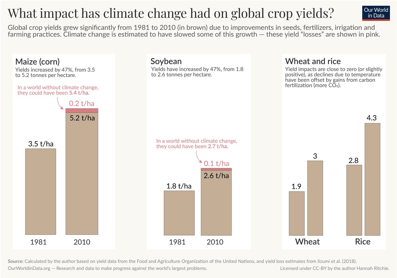 “Do you have a reference for this? Per the articles below, we have had larger crops due to technology improvement not climate change. The impact of climate change depends on the crop and region. No large net impacts so far. On a global average, doesn't look like a disaster in the future either; but, some regions and crops may have significant negative impacts. Also need to consider extreme events which will pack a bigger punch in a warmer world. A bad year can be destabilizing regionally.