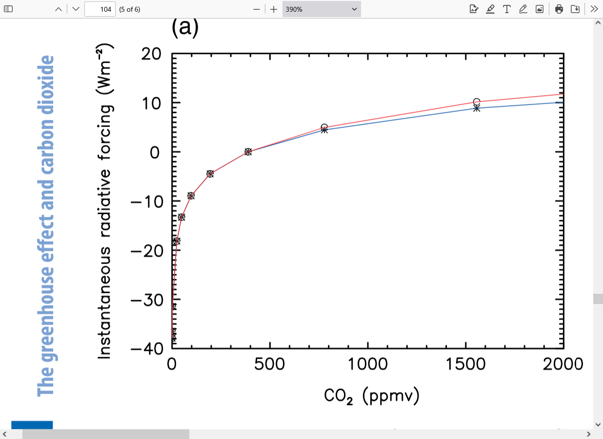 Added: mike: You can see below on the graph that as CO2 increases, the warming/forcing impact per molecule drops.