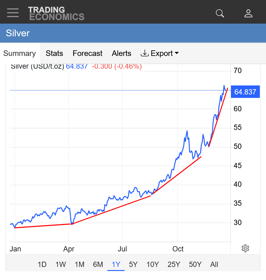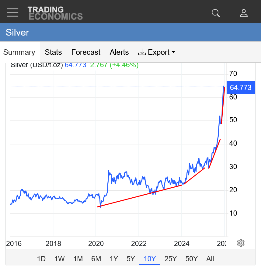 3. 10 years: Parabolic/exponential move up, like silver, just not as strong this year as silver. Increasingly steeper and steeper slope to the upchannel. It can't continue forever but its almost impossible to know when it will end. Still below all time highs last month.