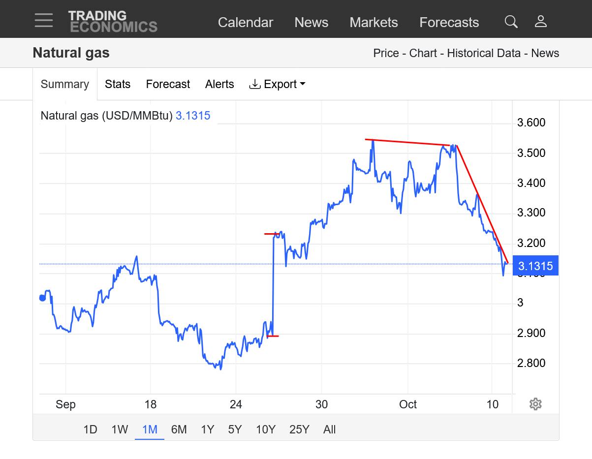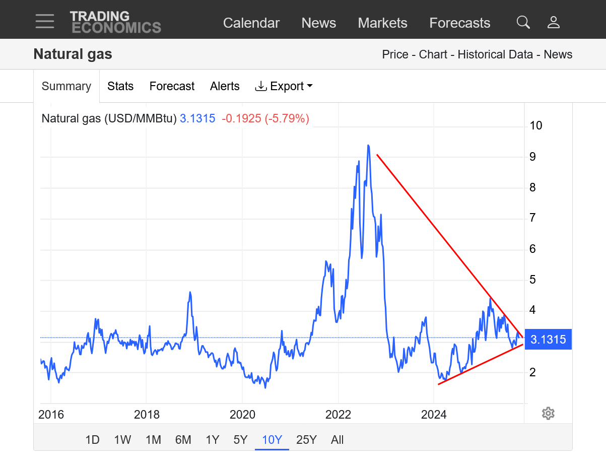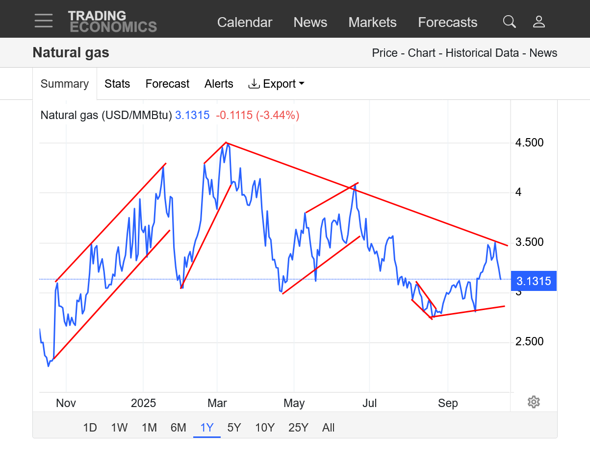 These are prices the last year. The last month+ has set up a clear symmetrical wedge pattern with lower highs since the big March top(from last Winters cold drawing down storage-a 2nd lower, early Summer high-then a 3rd, even lower high to start October, with very mild temps the first half of October pressuring prices.