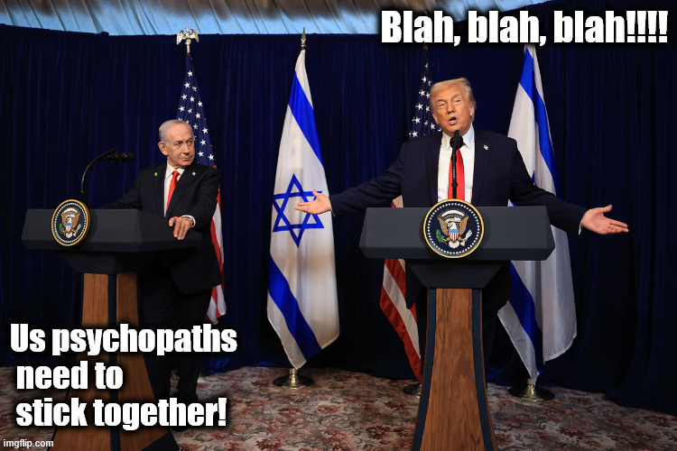This, while Trump is telling us the complete opposite........that all sorts of countries are lined up to assist him and his peace plan in Gaza. Even while Israel is KICKING THEM OUT because they are a rogue state led by a genocidal psychopath!