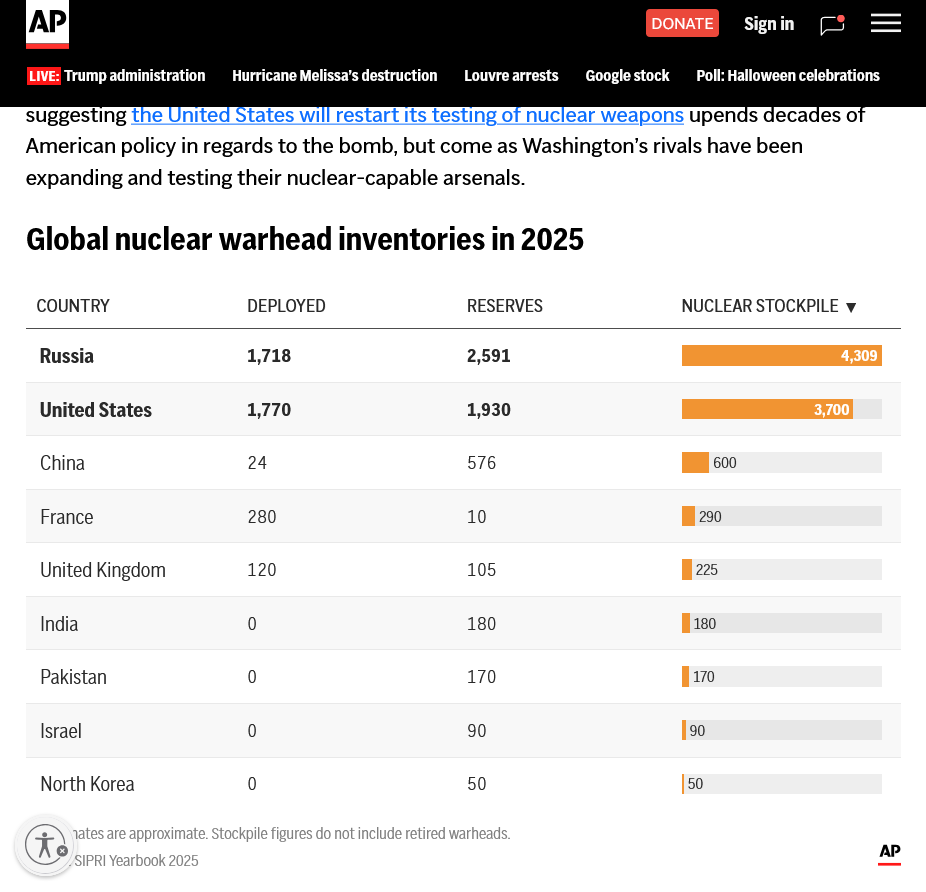 On Wednesday evening, the president placed this post on his Truth Social site:The United States has more Nuclear Weapons than any other country. This was accomplished, including a complete update and renovation of existing weapons, during my First Term in office. Because of the tremendous destructive power, I HATED to do it, but had no choice! Russia is second, and China is a distant third, but will be even within 5 years. Because of other countries testing programs, I have instructed the Department of War to start testing our Nuclear Weapons on an equal basis. That process will begin immediately. Thank you for your attention to this matter! PRESIDENT DONALD J. TRUMP
