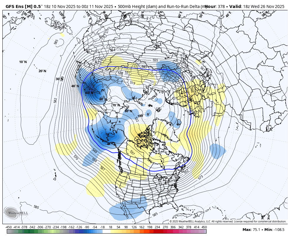 The thing that jumped out at me about the 6z GEFS was the humongous late week 2 changes.. This map shows the RELATIVE CHANGES from the previous run, not just the absolute anomalies. Note that huge increases in the positive and negative anomolies that really strengthen the high latitude ridge/middle latitude trough downstream couplet. This is the northern stream determinant in how powerful the cold air delivery will be. In this case, the magnitude of the anomalies is getting pretty extreme.