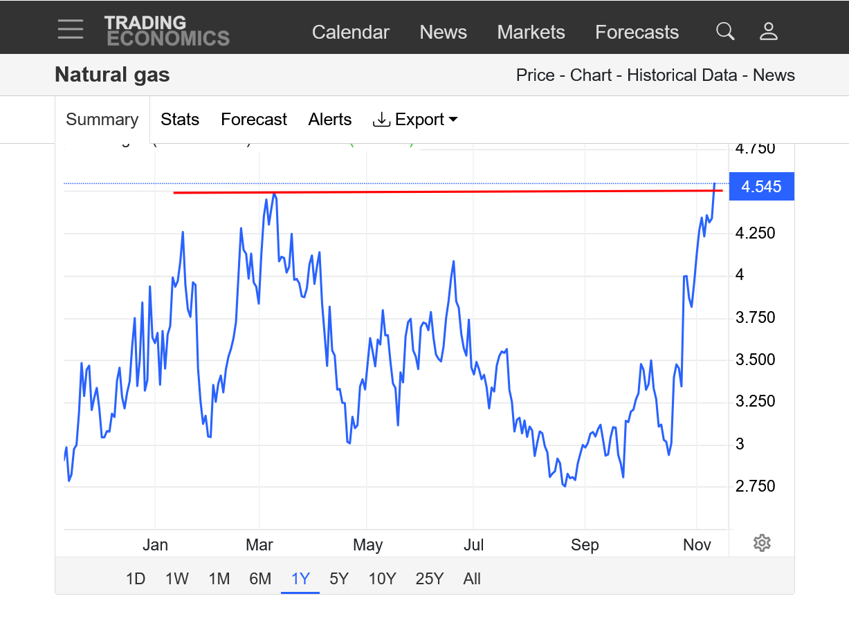 12:30pm: There is no question that we can still blow thru those highs and then some if the forecasts get cold enough, especially this early in the season and ESPECIALLY after the numerous Arctic blasts last Winter caused the many big weekly drawdowns in storage and big price surges last Winter.