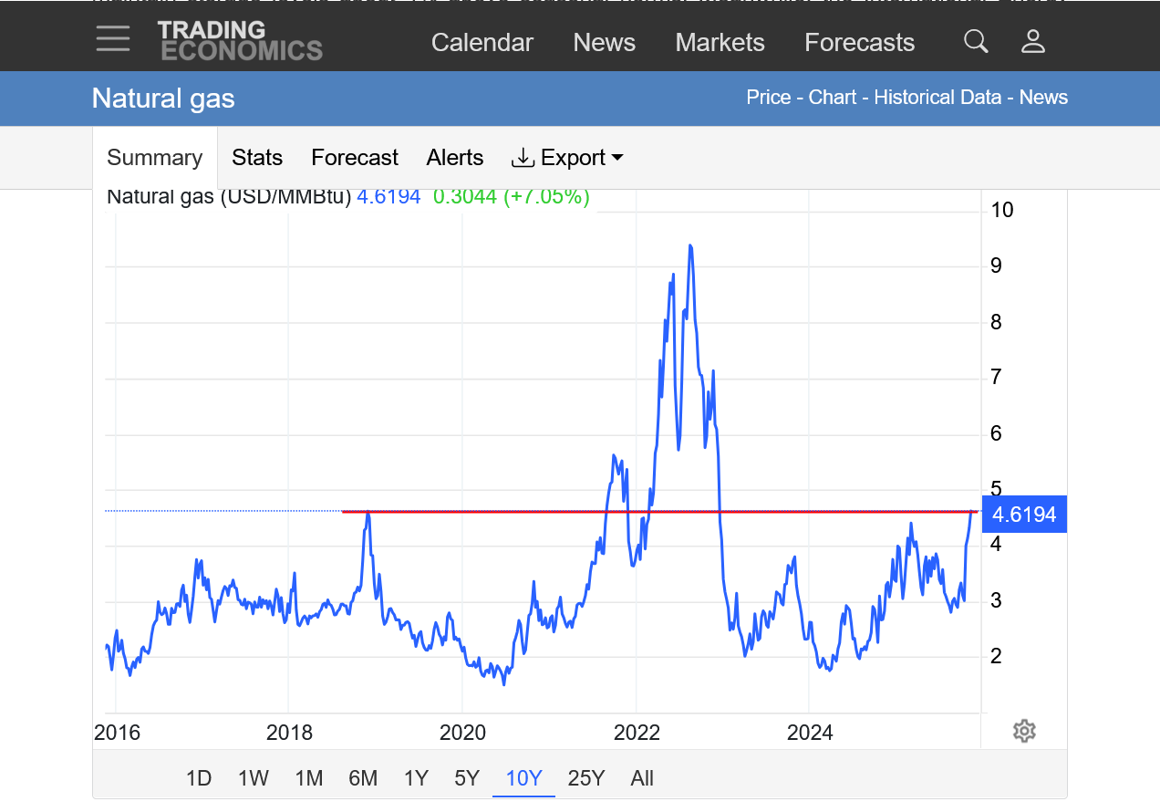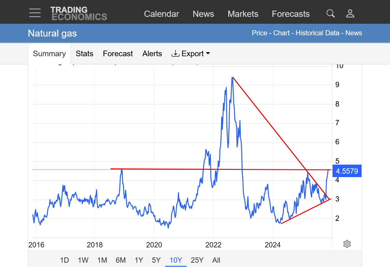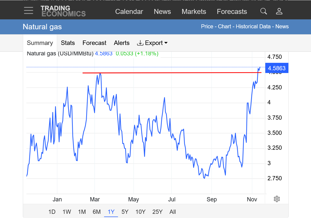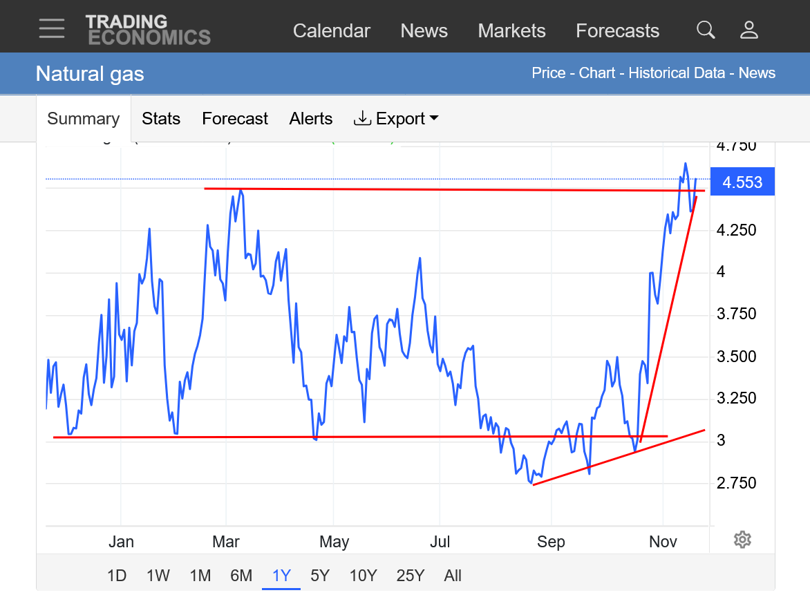 3. 1 year: Crystal clear bottom and huge price increase ahead of this long expected pattern change to MUCH, MUCH colder coming later this month. Current prices are close to the price we spiked to at the end of last years COLDER than average Winter, which caused huge drawdowns in storage.