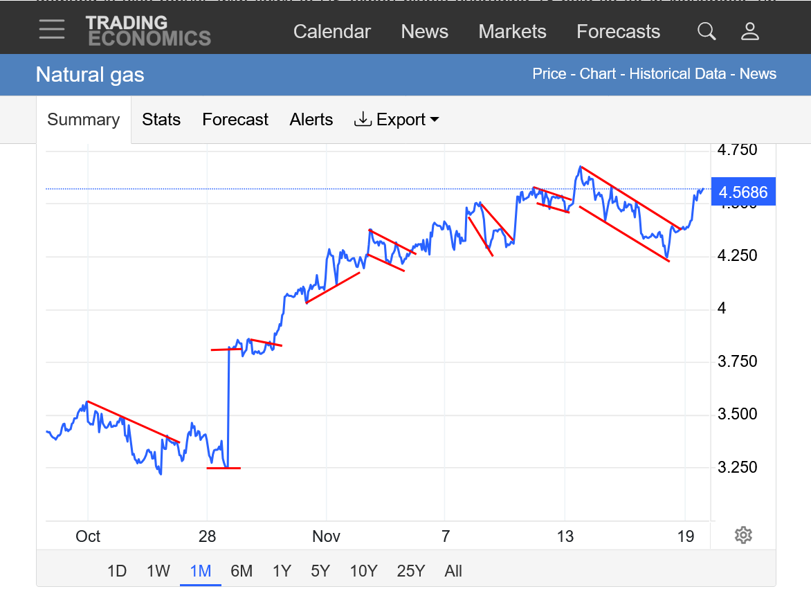 2. 1 month: The red HORIZONTAL lines are not actually a price gap but instead, when the lower priced front month, November rolled over to the higher priced December. The rest of the lines are a bunch of BULL FLAGS/WEDGES, which are price continuation formations/signatures. Most of the upside break outs from the bull flags came from a colder weather model. This last, much longer bull flag formation came from milder model solutions that lasted for numerous days. Now, we're back to colder and are apparently breaking out to the upside again. NEW HIGHS are needed to confirm another bull flag instead of a top.
