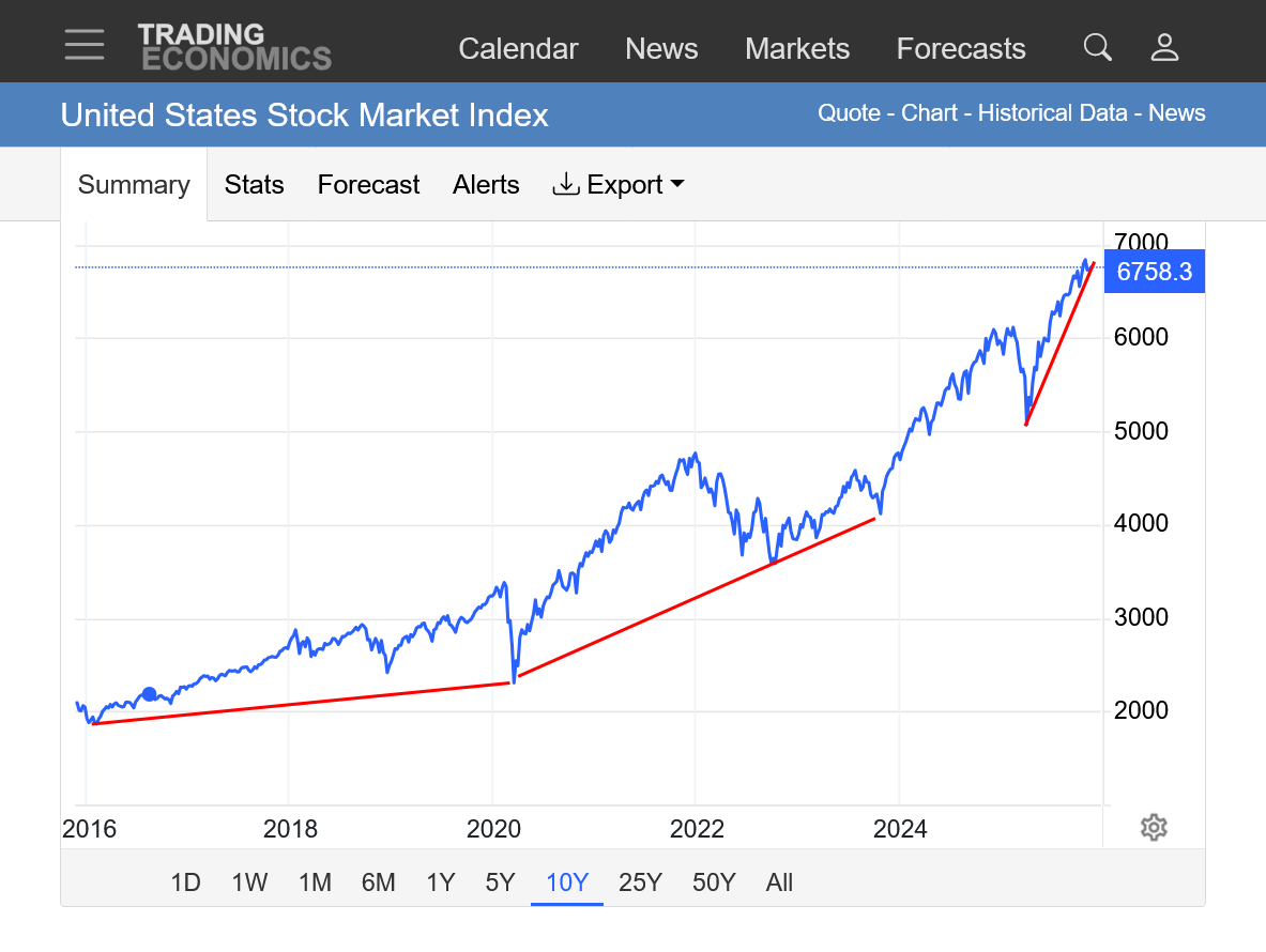 4. 10 years: Parabolic, exponential move(steepening slope up of the move) that can't go on forever as it distances itself from authentic intrinsic valuations and ignores bad economic reality news.... but it can go on indefinitely as long as money keeps flowing in.