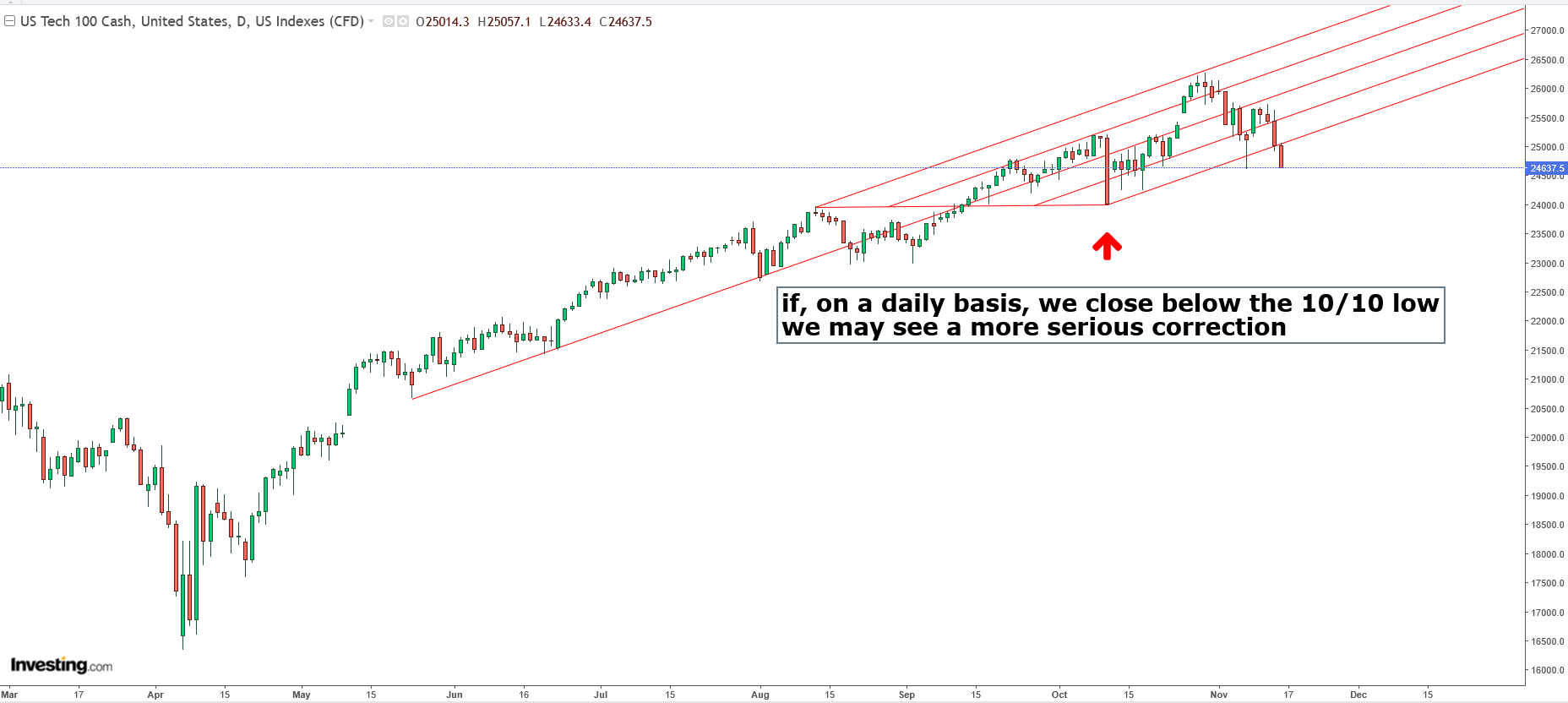 The above chart is the NQ daily, we still have not closed below the 10/10 low but we're getting close