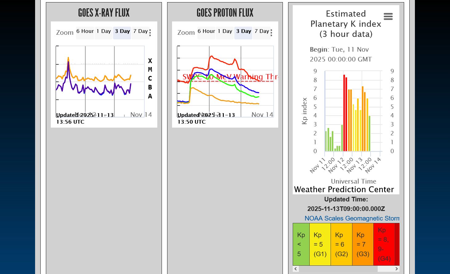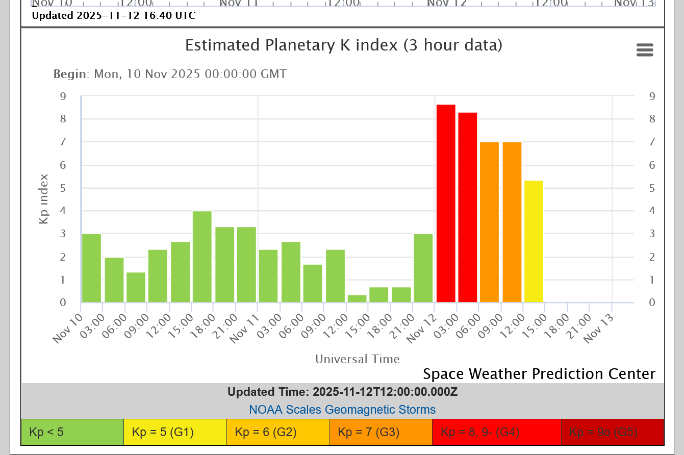 The aurora tonight does not appear to be as strong as last night. We can see the very brief spike up on Tuesday in reds that was timed perfectly to the dark evening hours in North America!