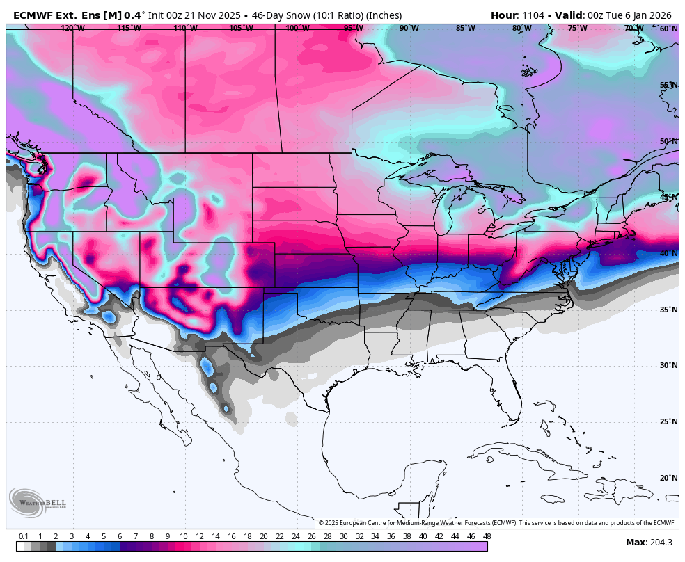 Total snowfall the next 6 weeks(thru January 5, 2026). There will be swaths of snow laid down by individual storms/perturbations, instead of an increasing/decreasing snow gradient distribution pattern like this.