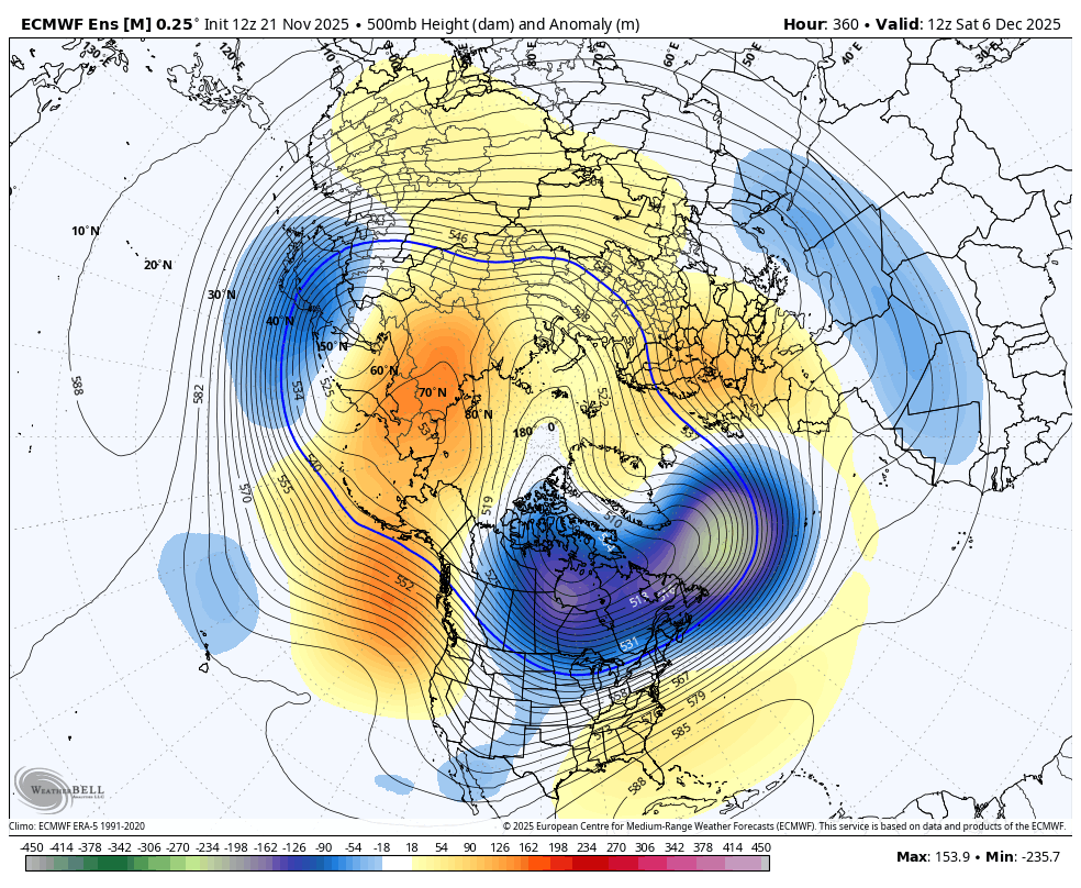 500 mb map from the last 12z European Ensemble model at 360 hours. December 6th. This is around 16,000 feet above the ground and a point where half the atmosphere's weight is above it and half of it is below it.
