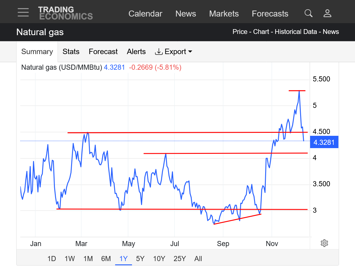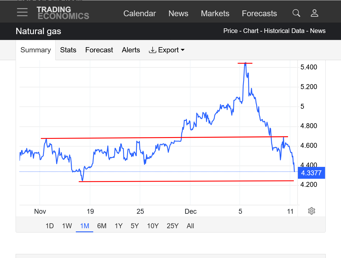 2. 1 month: Fake break out. Below the November high/breakout. Approaching some support but continued warmer forecasts will smash thru that too.