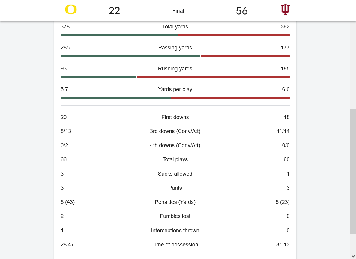 Team stats were actually fairly close above but IU got 3 turnovers that they turned into 21 points. Had less penalties. Sacked the OR quarterback 3 times had less penalties and were better coached.