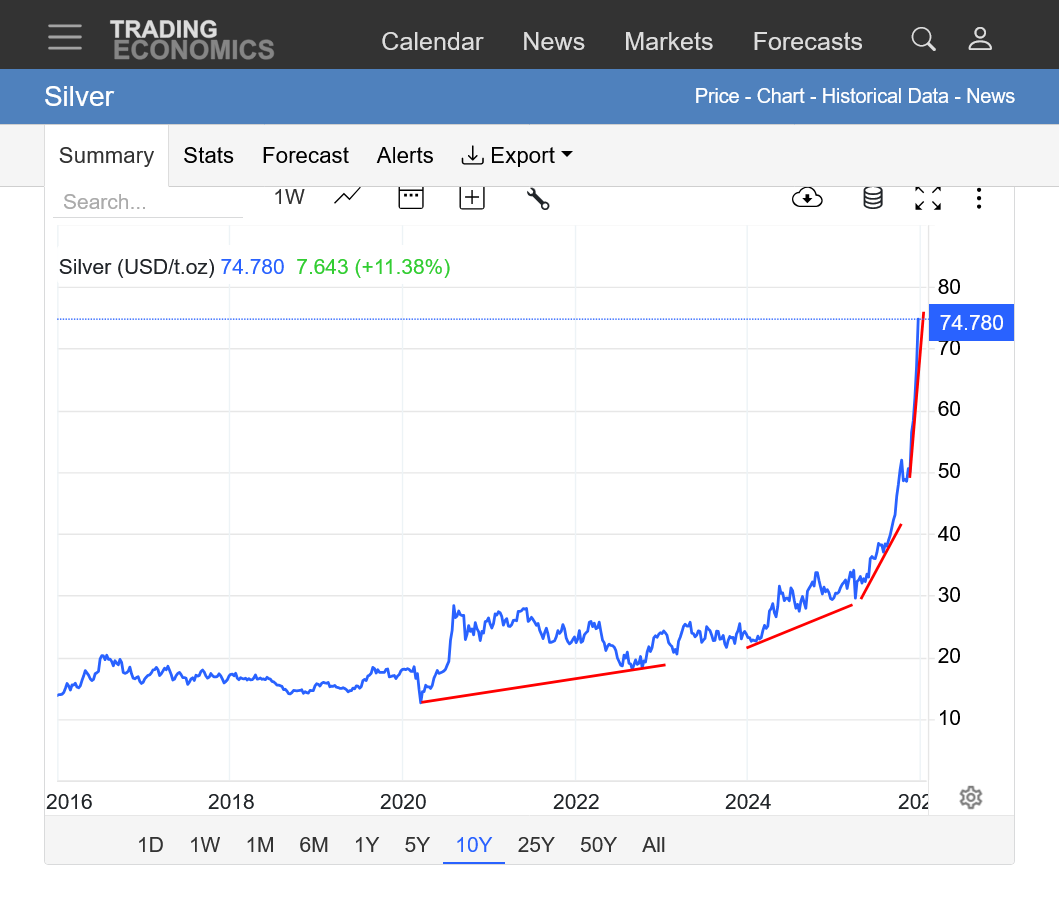 2. 10 year: Parabolic/exponential move up. Steeper and steeper slope. Initially leading silver but now the follower