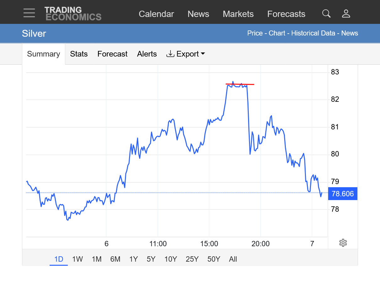Silver today closed at 79.675 +7.990 compared to Wednesday's close.