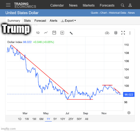1 year: Dollar crashes down 10% under Trump and below $1+ key support. Retesting that in November with a failed dead cat bounce. $1 is now brick was resistance.