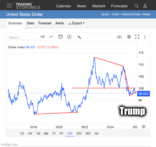 His ruinous to everybody tariffs, especially have decimated the trust in the United States. Foreign countries, instead of increasing business with the United States are REPLACING us with new relationships with other countries that have leaders and agreements that they can rely on.