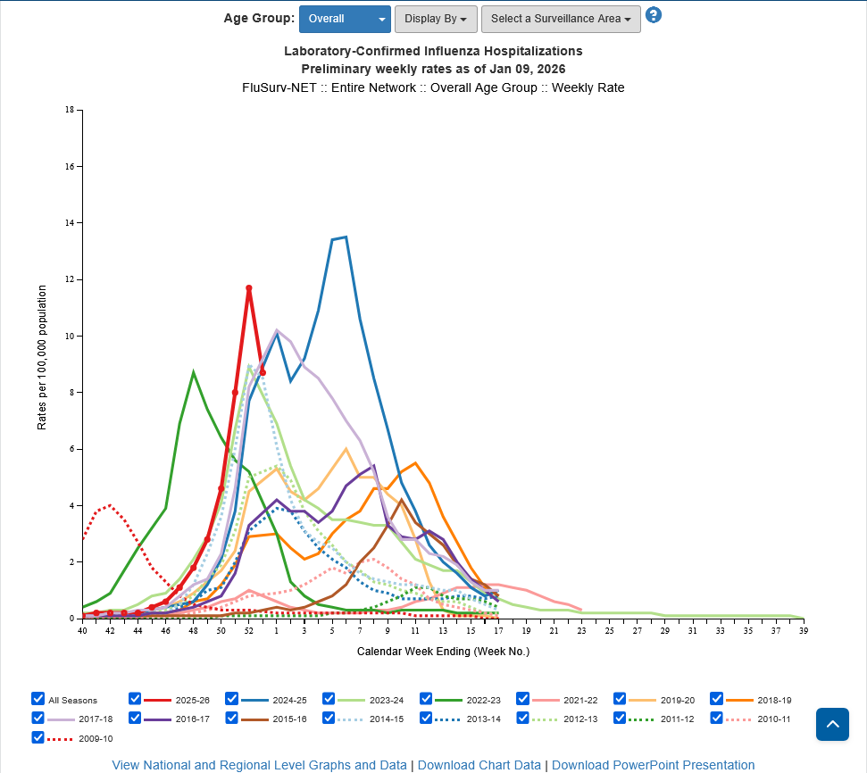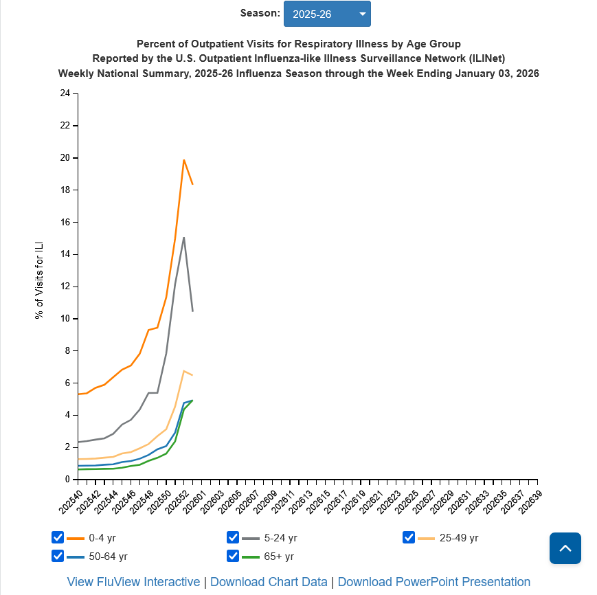 For this particular week, here in early 2026 we are close to the highs in previous years at this time. I noted there is no graph for the 2020-21 season. COVID hit hard, starting in March 2020 so we can assume that the CDC had all hands on deck focusing on COVID cases and neglected the flu that year.