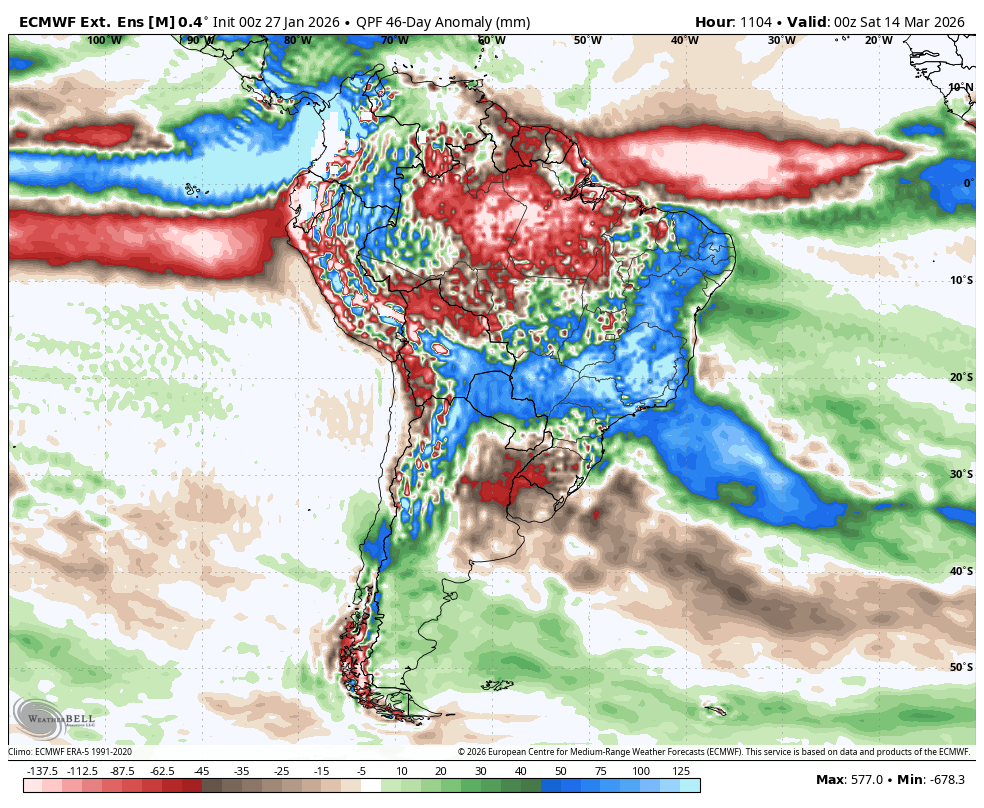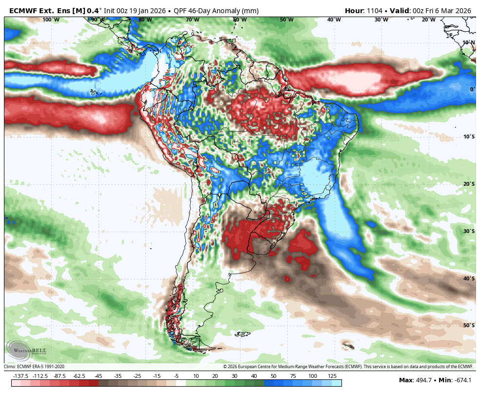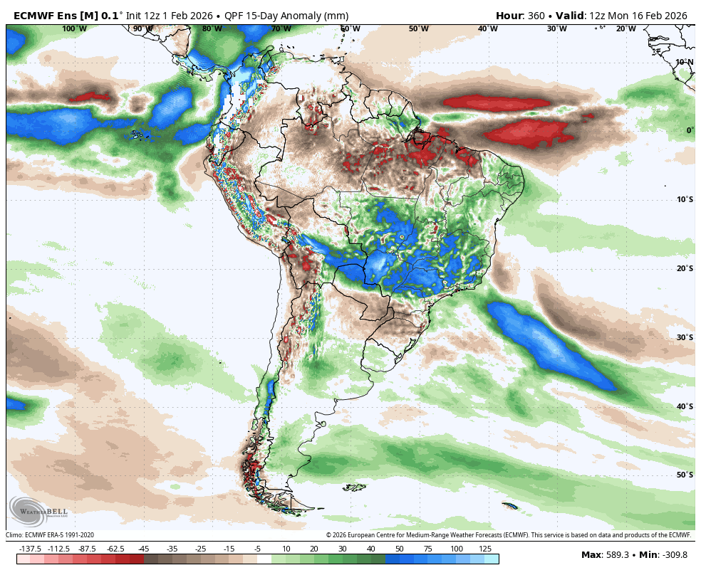 1. 2 week Rain departures from the last 12z European Ensemble model. Slightly above average rain for Argentina now. Still a bit too much rain in central parts of Brazil.
