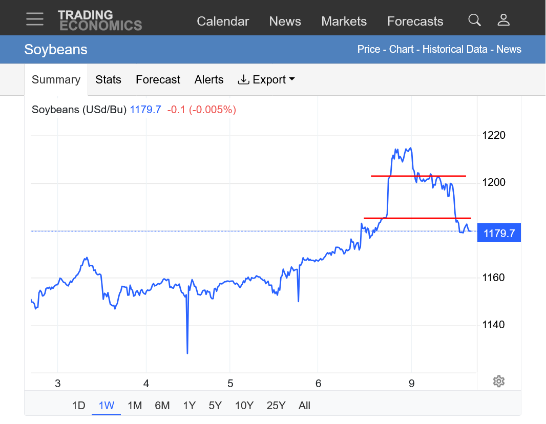 U.S. corn export sales last week were the week's best in five years. Soybean sales were easily a record for the week (irregular purchase timing), China had 1.2 mmt. Cotton sales were a MY high (340k RB).