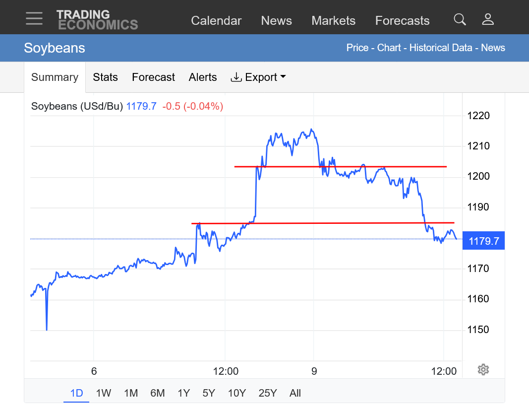 At 9:39 am CT(the time stamps here are ET) beans took off like a rocket. SH26 was up by almost 50c at the peak, now up around 30c. Can't find the news yet but this WAS from news.