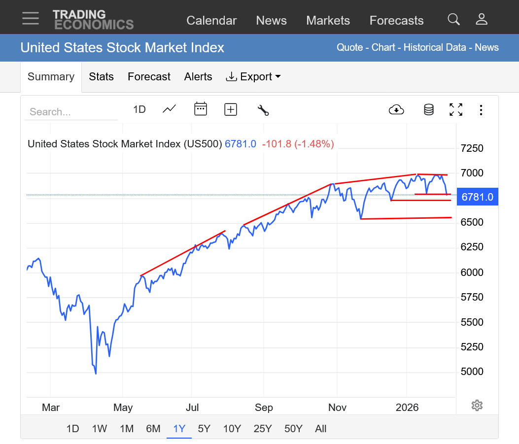 It looked like a potential head and shoulders top(1 top-head, with 2 slightly lower tops on either side-shoulders, then the neckline support being the 2026 lows.
