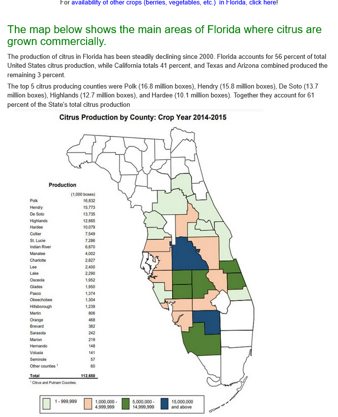 As you can see above, much of the crop has been harvested already even though the size of the crop is tiny compared to 2+ decades ago as the result of the citrus greening BACTERIA disease destroying the trees. Originally, it was thought to be from a virus.