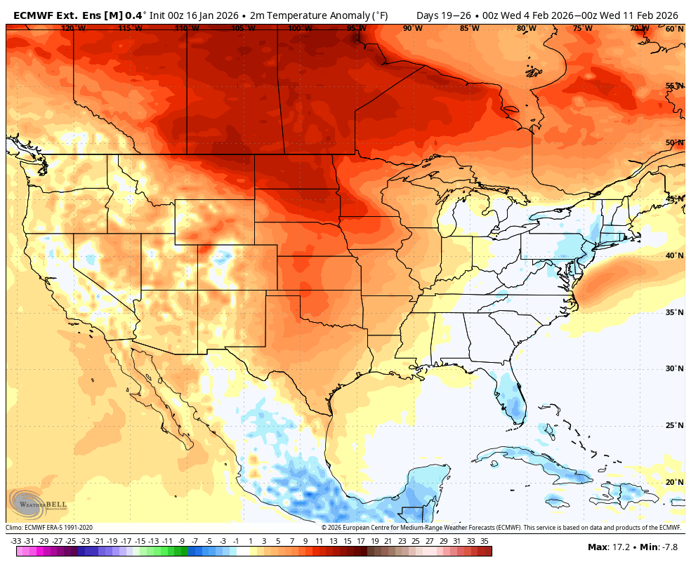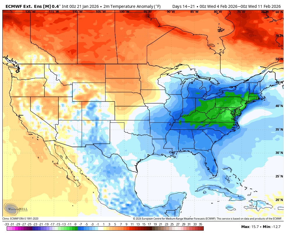 The last 12z European model cranked up the cold again in week 2 as we expect February to turn colder again. The cold will be focused on the East which has the highest population density.