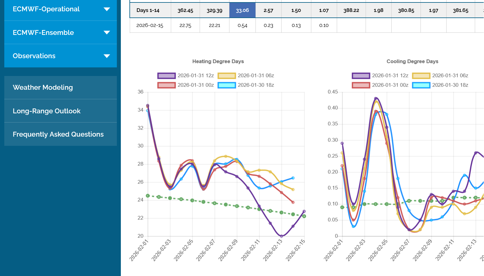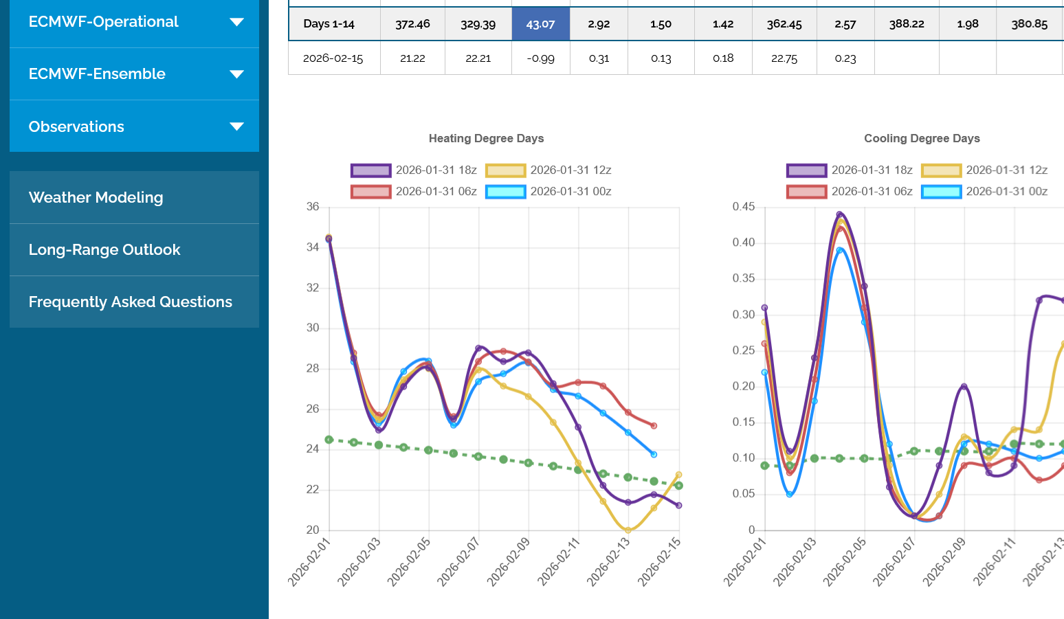 The 12z European Ensemble model (purple/left) had -6 HDDs compared to the previous 0z run,