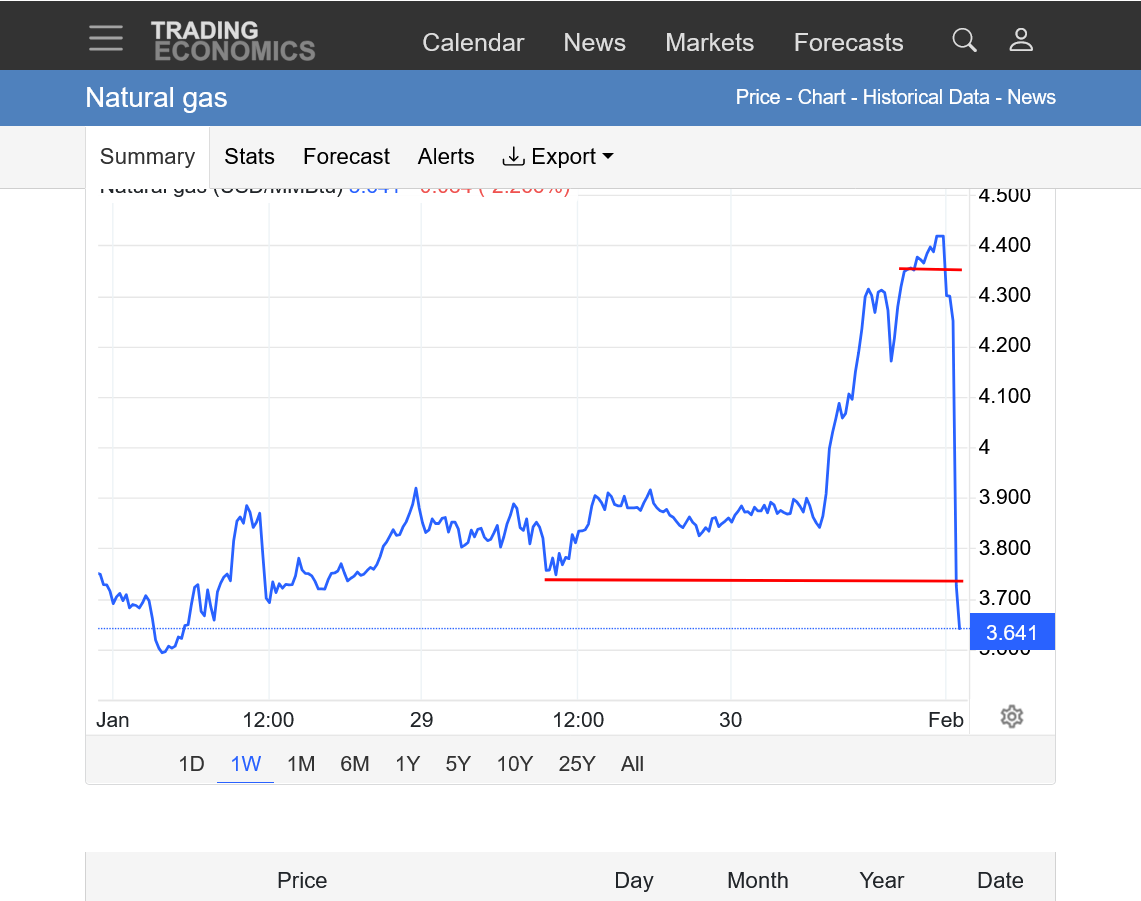 The reality, is that March natural gas had a spike high of $4 this week and we are not far from it. The Feb contract graphed below, spiked close to $7.5, actually HIGHER than depicted below. This source has been rendered unreliable and not helpful(other than to demonstrate what I'm pointing out about what just happened). I will show it again when its able to do better.