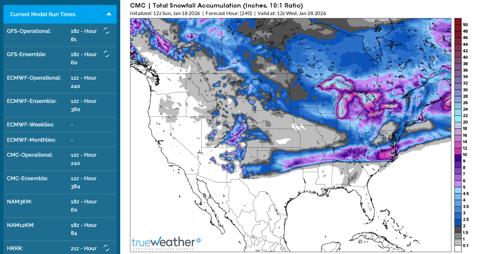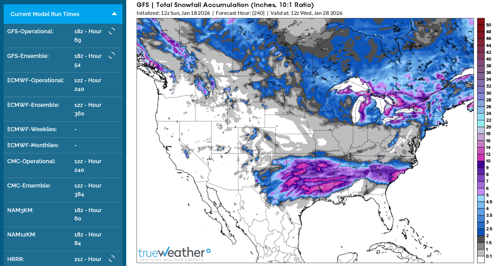 10. The big picture we see below is still capturing the essence of the upcoming event. Despite some inevitable surprises that cause several places to have a few inches more or less than the color predicted or for a shift farther north or south, numerous days of the same but evolving picture and it being on our doorstep give it a 100% chance of happening.