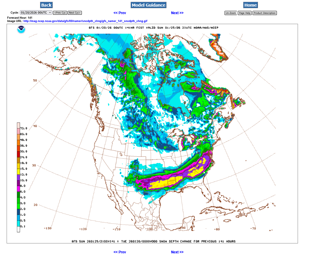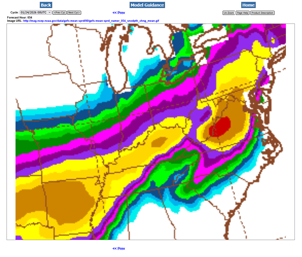 The just out 0z GEFS continues to confirm some hefty amounts in Evansville. The 10+ inch band is just north of the Ohio River. I zoomed in and put the color code below to make it easier to interpret. the yellow is 12+ inches. That red dot in the state of Virginia is 24 inches of snow.