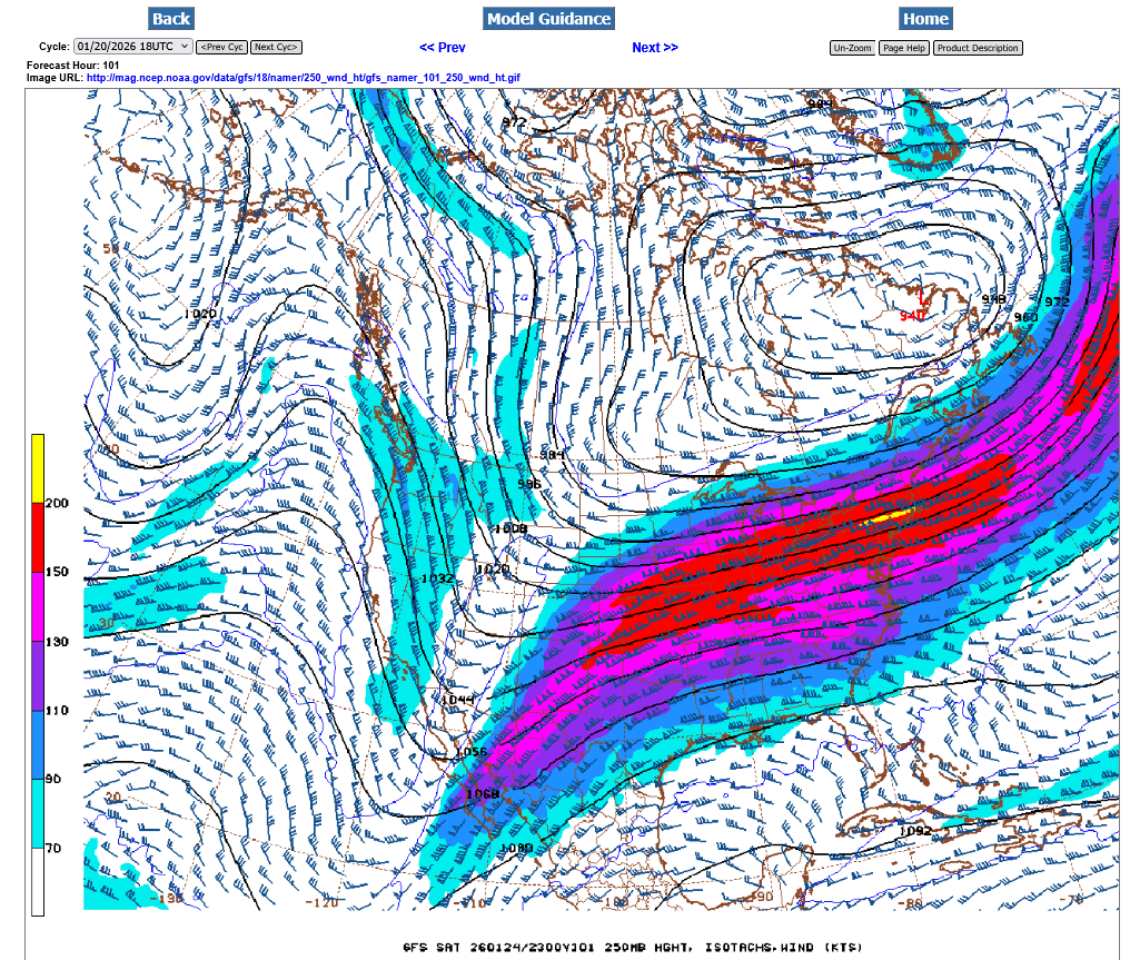 2, On Saturday, thanks to the 2 streams phasing, the magnitude of the highest jet streak winds jumps from just over 200 mph to 250 mph in around 24 hours. The units/colors below are in KNOTs. 5 knots = 6 mph. There's even a bit of yellow the top color in the jet streak/center.