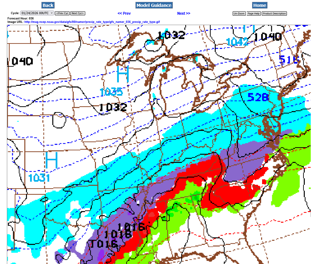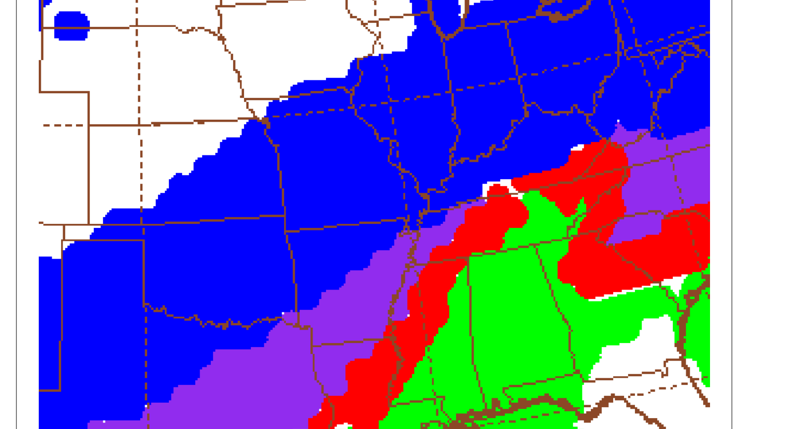 Blue=Snow Purple=Sleet Red=Freezing Rain Green=Rain