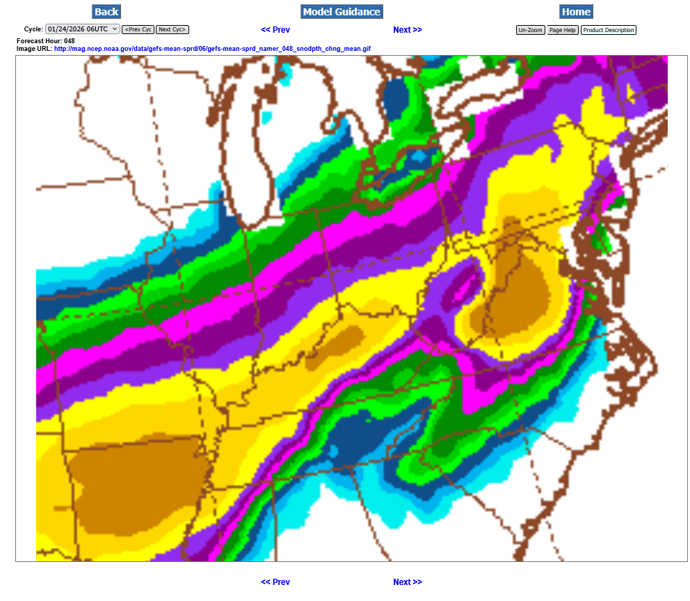 This last 12z GEFS was incredibly different than the previous 6Z run, just 6 hours earlier. Shifting everything even farther south(completely missing S. Indiana with even the northern fringe along the KY/TN border now) and reducing the amounts. Regardless, the yellow is a foot+ of snow and that's enormous for area's that far south.