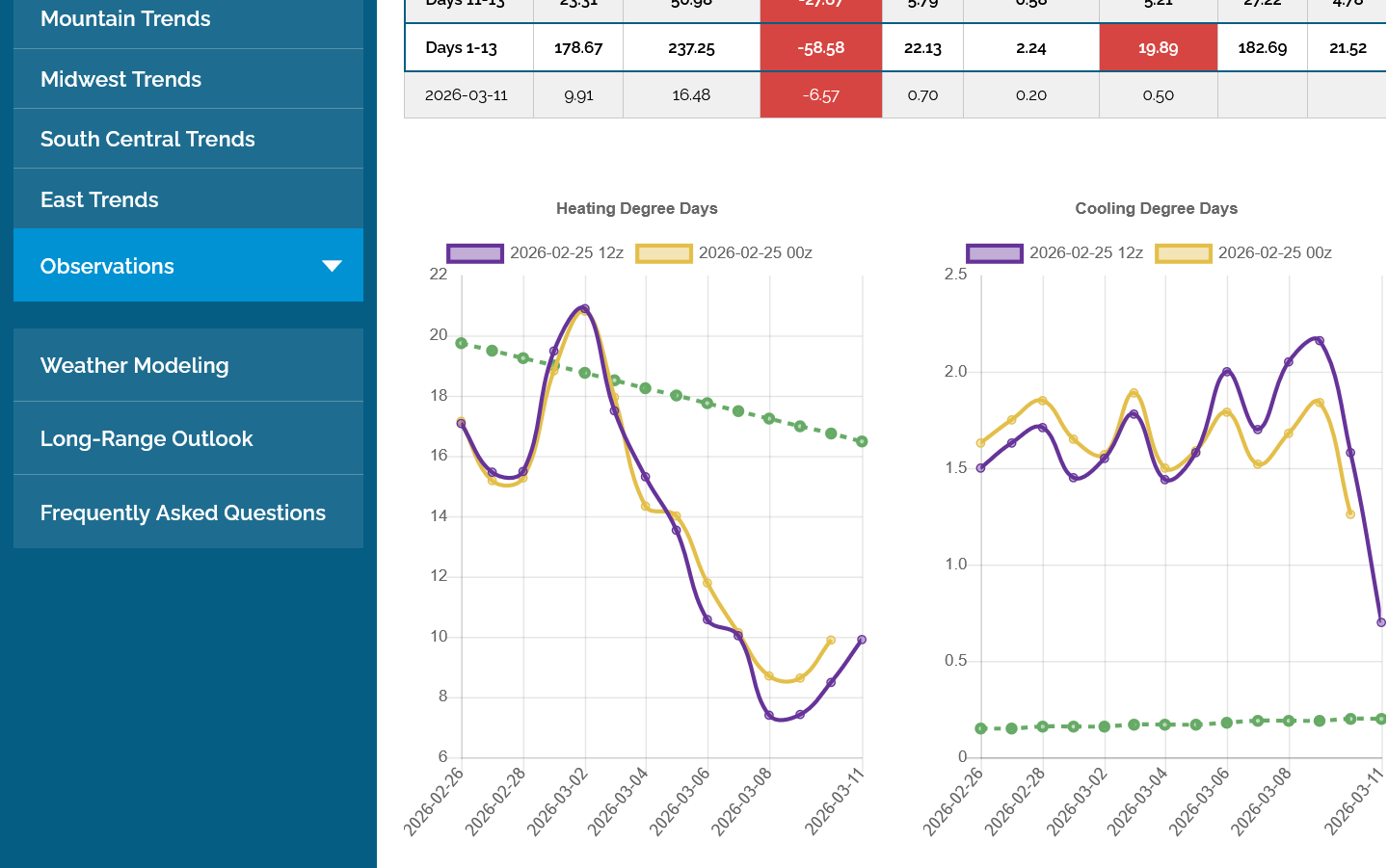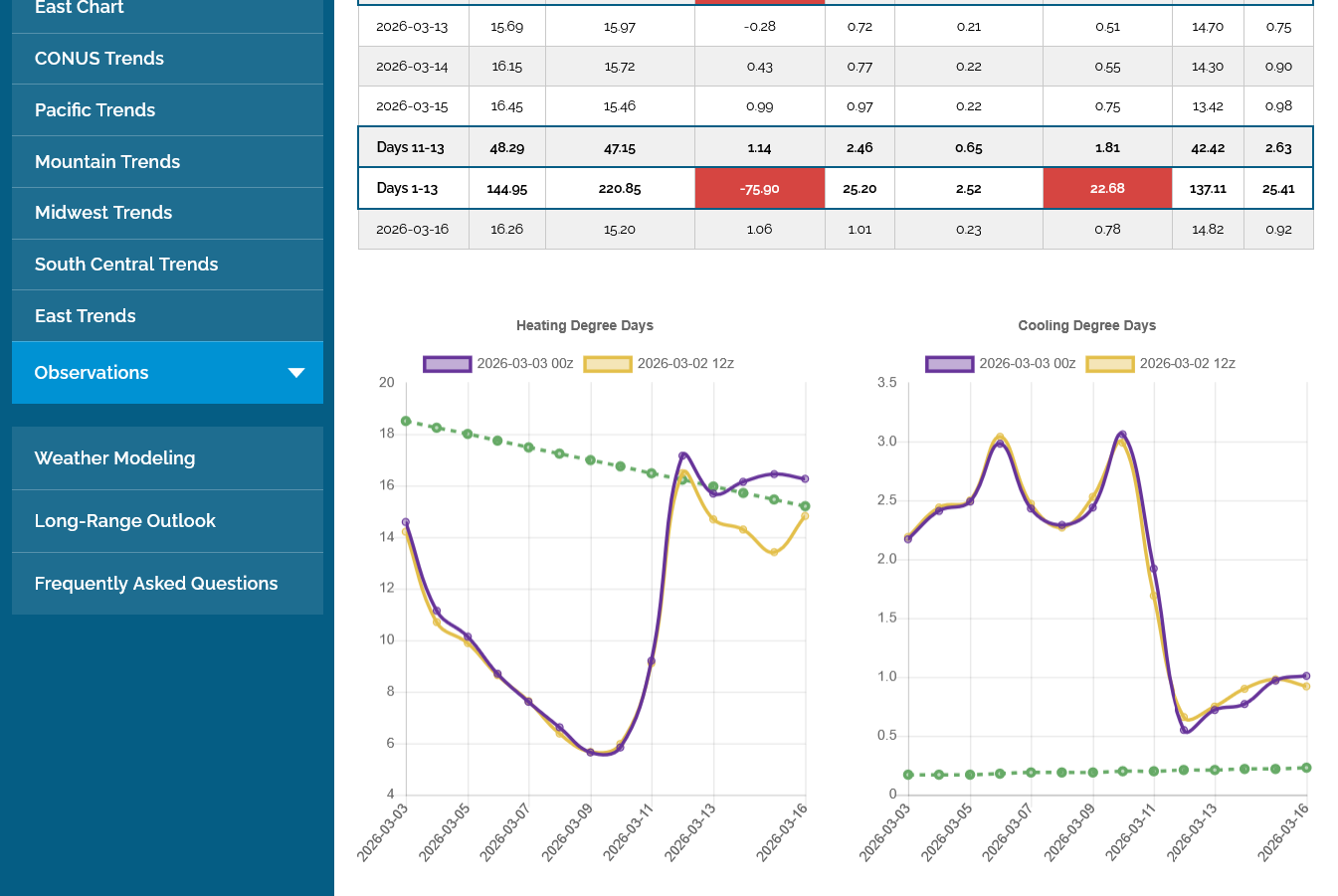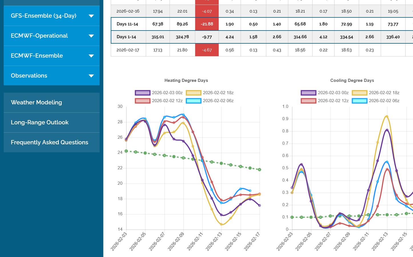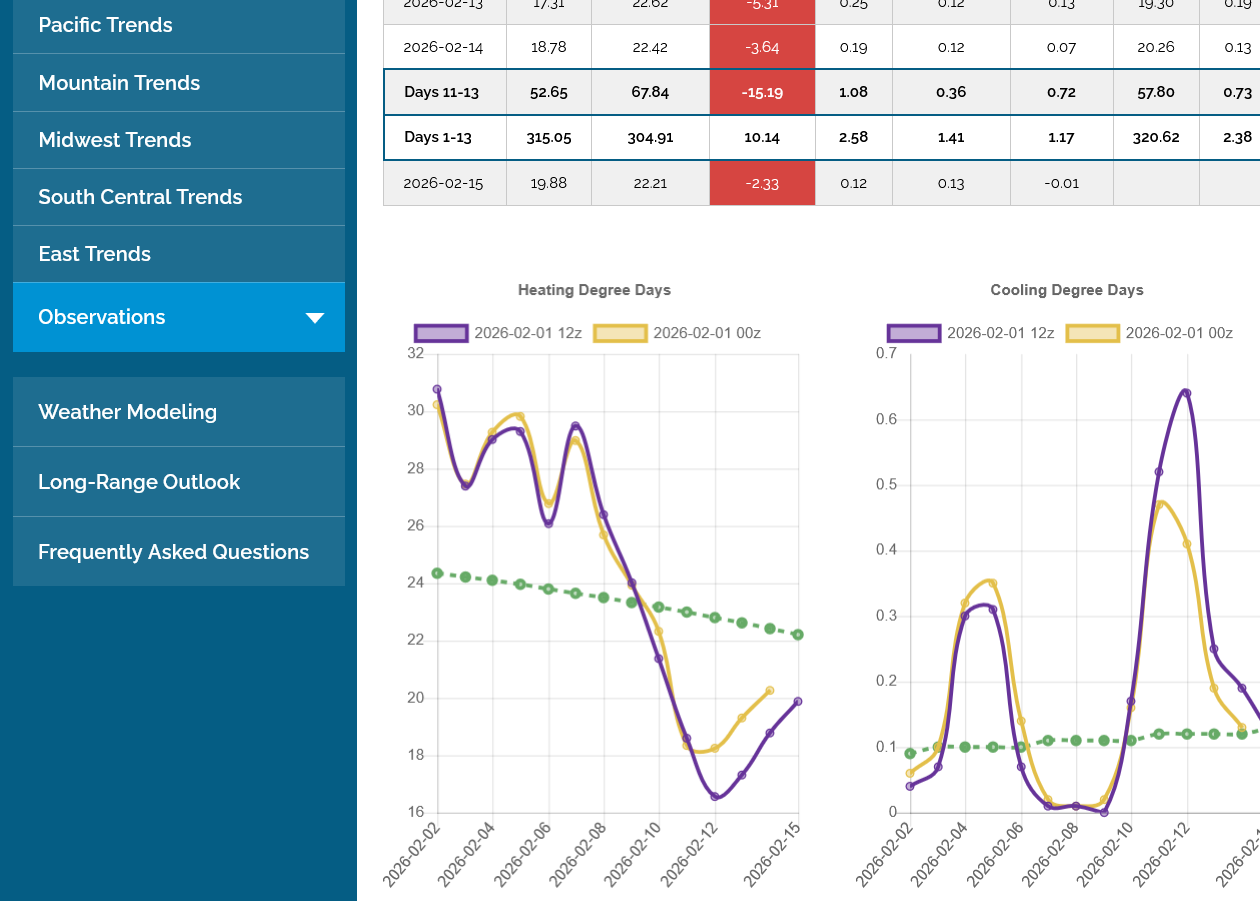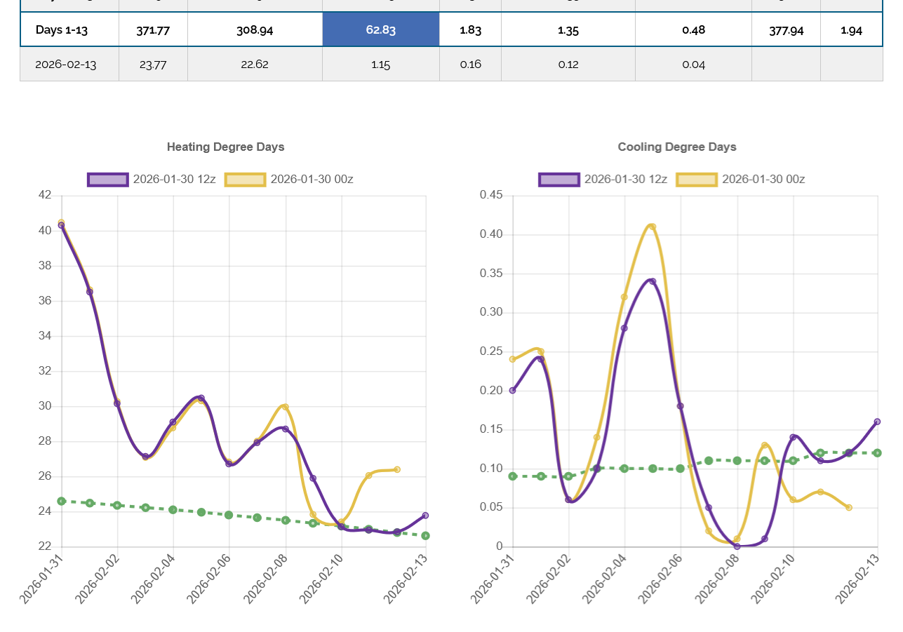 The 12z European Ensemble model (purple/left) had -6 HDDs compared to the previous 0z run,