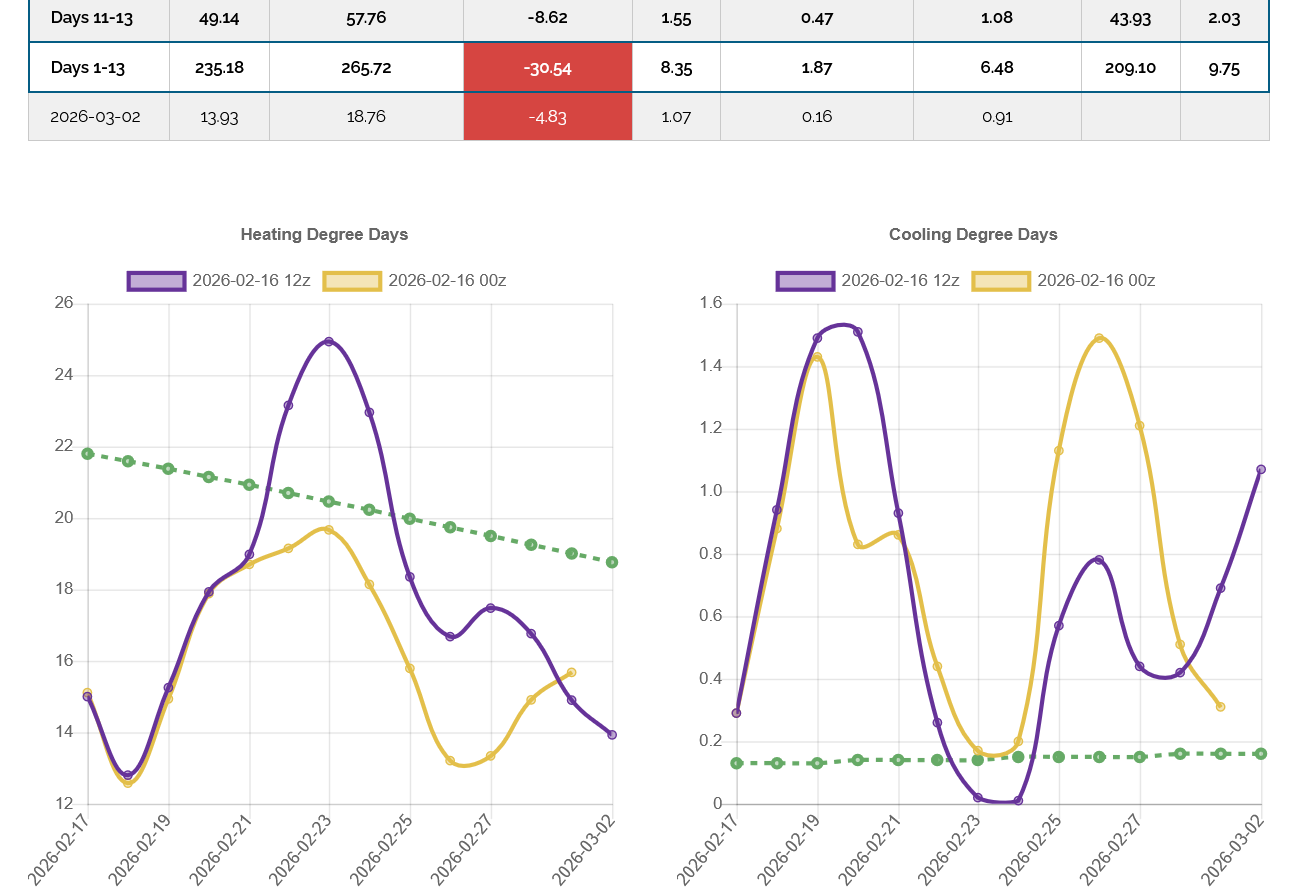 The 12z European Ensemble model (purple/left) had -6 HDDs compared to the previous 0z run, which caused a small drop but NG was on a tear higher today because of the cold February forecast and the fact that March is priced pretty low vs the February that just expired/went off the board.