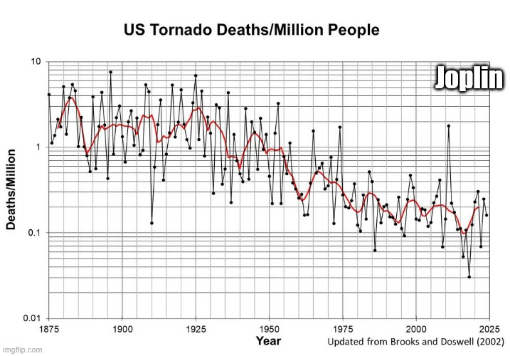 Climate change has been helping too by warming the highest latitudes the most and weakening cold fronts and jet streams! This has reduced the number of the strongest tornadoes by around 50%!