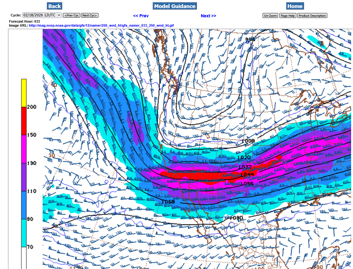 Shifting the map much farther east and time frame to late Thursday, we see the MAINg jet stream aimed in this direction. The red shade is 150 knots which is almost 175 mph.