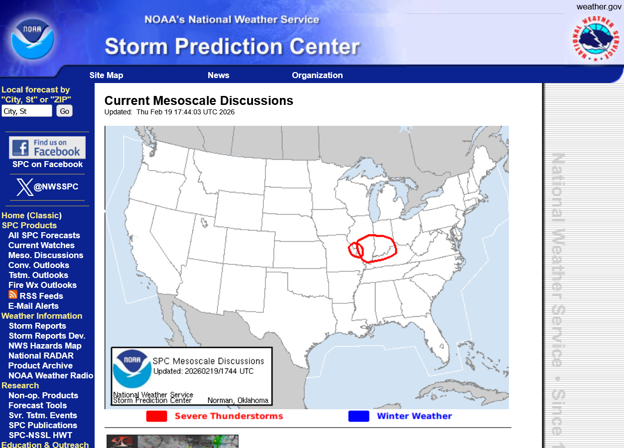 The Storm Prediction Center issued this below a couple of hours ago, with their last mesoscale update which is NOT verifying or the NWS previous outlook for the southern part of the area, including Evansville.